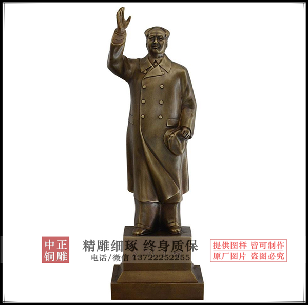 毛主席人物雕塑像面朝東南方,身著中山裝,左胸前掛著“主席”證,手執文稿,目光炯炯,面帶微笑,正視前方,巍然挺立,成功地再現了人民領袖毛澤東出席開國大典時的風采。