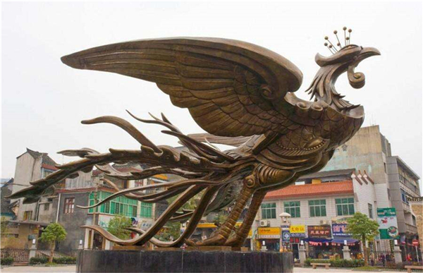鳳凰被認為是百鳥中最尊貴者,為鳥中之王。銅雕鳳凰雕塑的設計理念不僅是為了顯示身份高貴,更重要的是寓意家庭幸福美滿,事業繁榮昌盛。語本詩經大雅卷阿:“鳳皇于飛,翙翙其羽”。李白早夏于將軍叔宅與諸昆季送傅八之江南序:“重傅侯玉潤之德,妻以其子,鳳凰于飛,潘楊之好,斯為睦矣”。比喻男女相愛男子追求女子,也象征對美滿幸福的姻緣向往和歌頌。鳳凰亦有“愛情”、“夫妻”的意思。