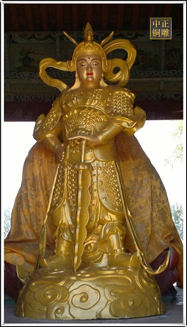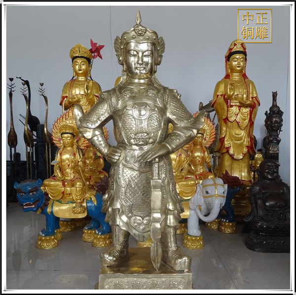 于是,韋陀被人們稱為護(hù)法菩薩。在中國(guó)的寺院殿宇里原印度血統(tǒng)的銅雕佛像韋陀已經(jīng)漢化了,成了一名地道的中國(guó)武將,英俊威武。他身披鎧甲,手持金剛杵,降魔去妖,威風(fēng)凜凜。天王殿中所塑的韋陀,一般具有兩種站立的姿態(tài),一個(gè)是雙手合十,橫杵于腕上,直挺而立;一個(gè)是一手握杵拄地,另一手叉腰。