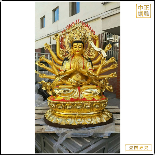 千手觀音又稱千手千眼觀世音、千眼千臂觀世音等,是我國民間信仰的四大菩薩之一。千手千眼銅觀音佛像中觀音千只手如扇面形排列幾層,有如孔雀開屏一般,十分壯觀,而對于千手觀音還有一個美麗的傳說。
