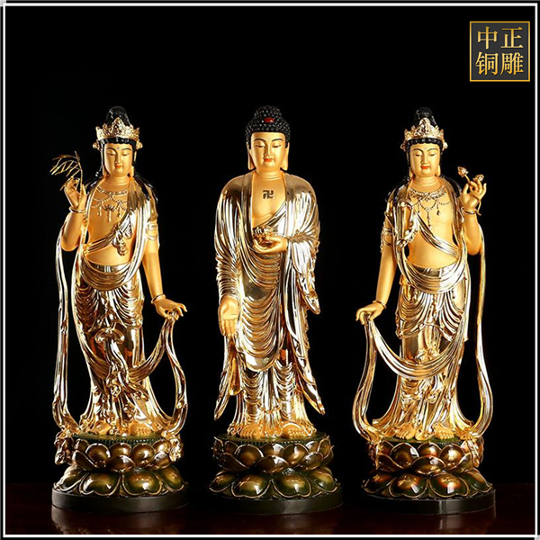 西方三圣又稱阿彌陀三尊,中間是阿彌陀佛,左邊大勢至菩薩,右邊為觀世音菩薩組成。西方三圣乃是凈土宗專修對象。 中正銅雕-西方三圣擺件、西方三圣擺件價格、西方三圣擺件廠家,我廠是一家專業生產人物雕塑的廠家,其質量和品質都非常可靠,有需要的客戶歡迎前來訂購。