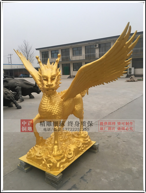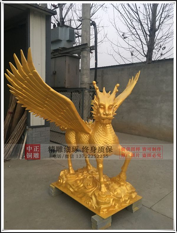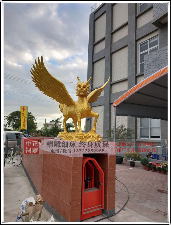 河北唐縣中正銅雕廠生產制作的鑄銅飛天麒麟,麒麟有臺灣客戶設計效果圖,我廠制作泥稿,開模,鑄銅。麒麟總高1.75米,底座高0.24米。鑄銅厚度8毫米。表面采用鈦金漆噴漆工藝,表面做氟碳漆保護。安裝于臺灣苗栗縣中天法門會場大門口。