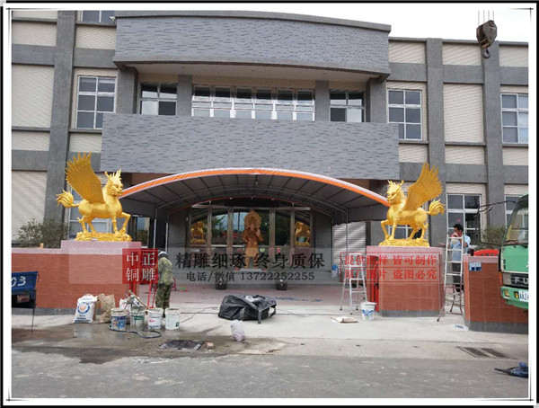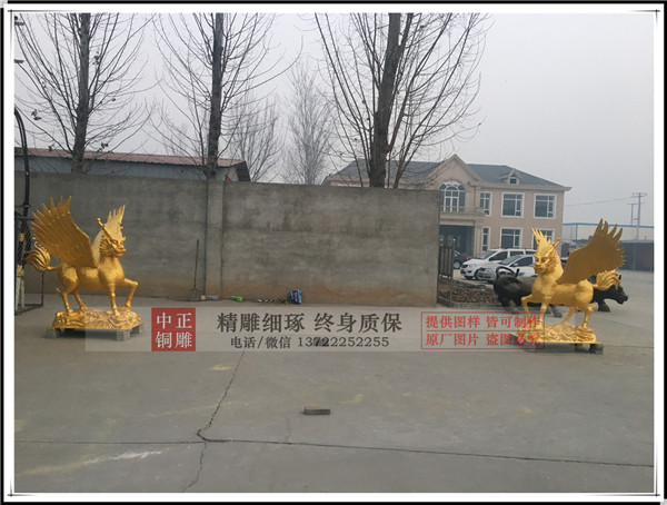 唐縣中正銅雕廠生產的帶翅膀銅麒麟安裝完畢